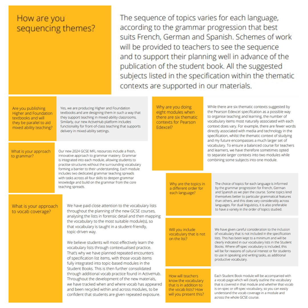 As the end of the academic year draws nearer, many schools are looking ahead to what they need for September. For those teaching the recently updated MFL syllabus there may still be questions about the various resources available. The team at Pearson have put together an introduction to their French, Spanish and German resources – all of which may be found in our annual Summer textbook Promotion – and share below some features, webinars and answer a few common questions from teachers…