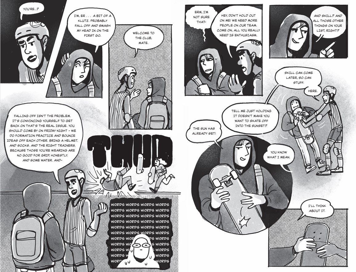 KICKFLIP is my debut young adult book, and my first graphic novel, illustrated with great energy and enthusiasm by Logan Hanning. It tells the story of Elliot Powell, a fifteen-year-old kid who is seen as a girl in school and a boy at the skate park, but neither of those labels actually fit them properly. It’s a story of first crushes, school bullies, best mates and supportive family, and is almost a sibling book to JAMIE. But unlike that younger protagonist, Elliot does not have a label for themselves that they are happy with. They are attempting to lead a triple life, with only their hugely loving mum knowing anything close to the truth. Elliot’s struggles are much closer to my own; existing in a state where other people seem to know you better than you know yourself, until one day the façade finally cracks. For Elliot, this is a celebratory moment, wrapped in the love and support of their friends and family. For many trans young people in Britain today, such a revelation might well be tinged with fear.